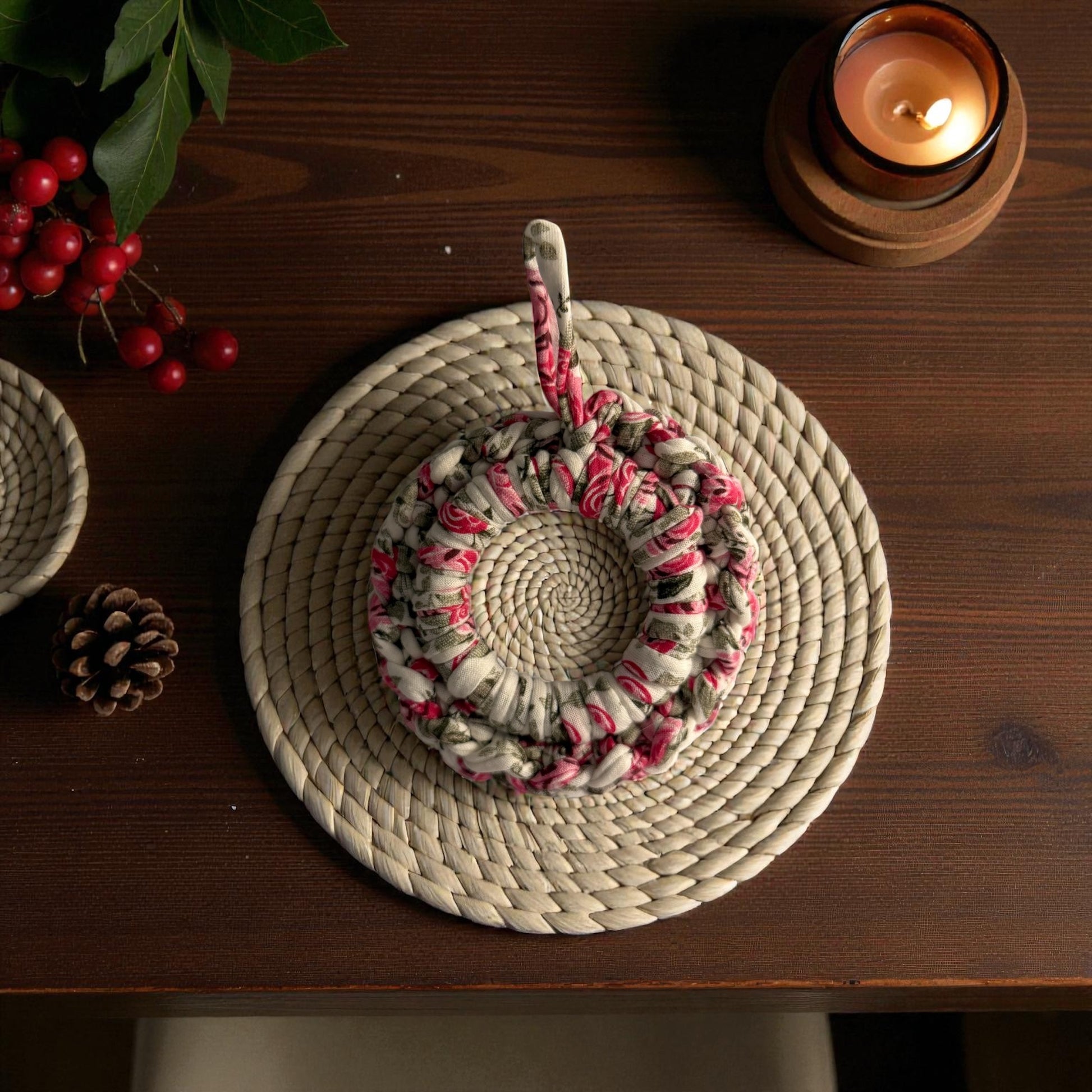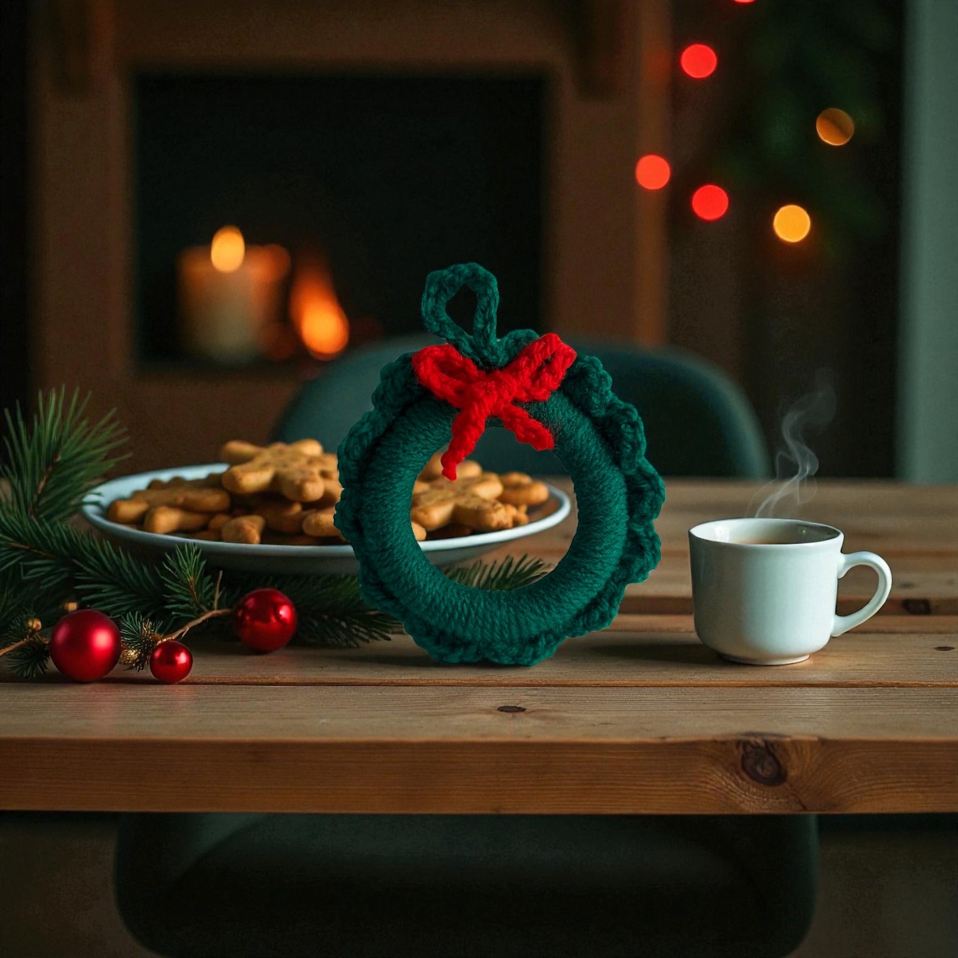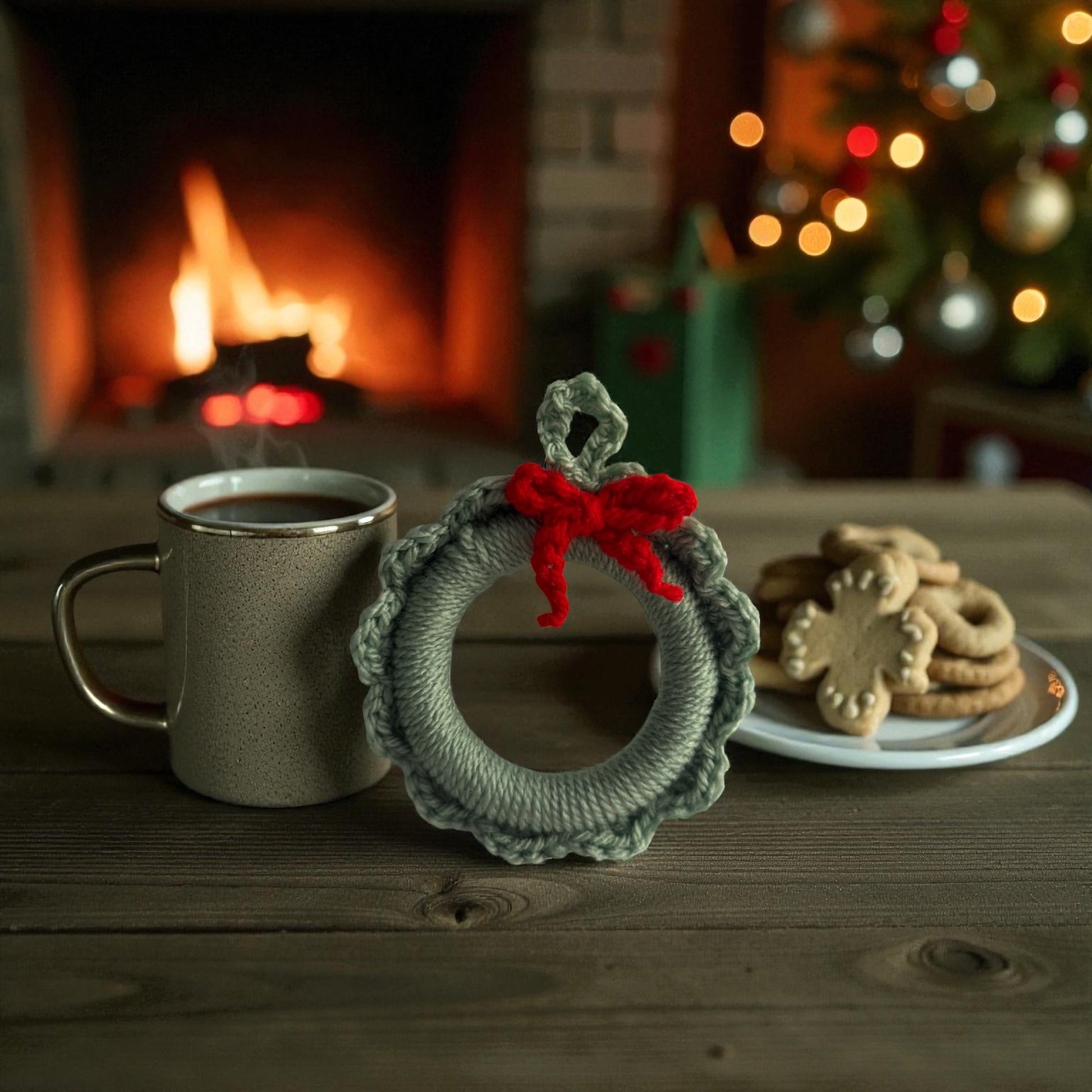 Petit rond en crochet orné d’un nœud rouge, parfait pour décorer le sapin avec une touche artisanale et chaleureuse.