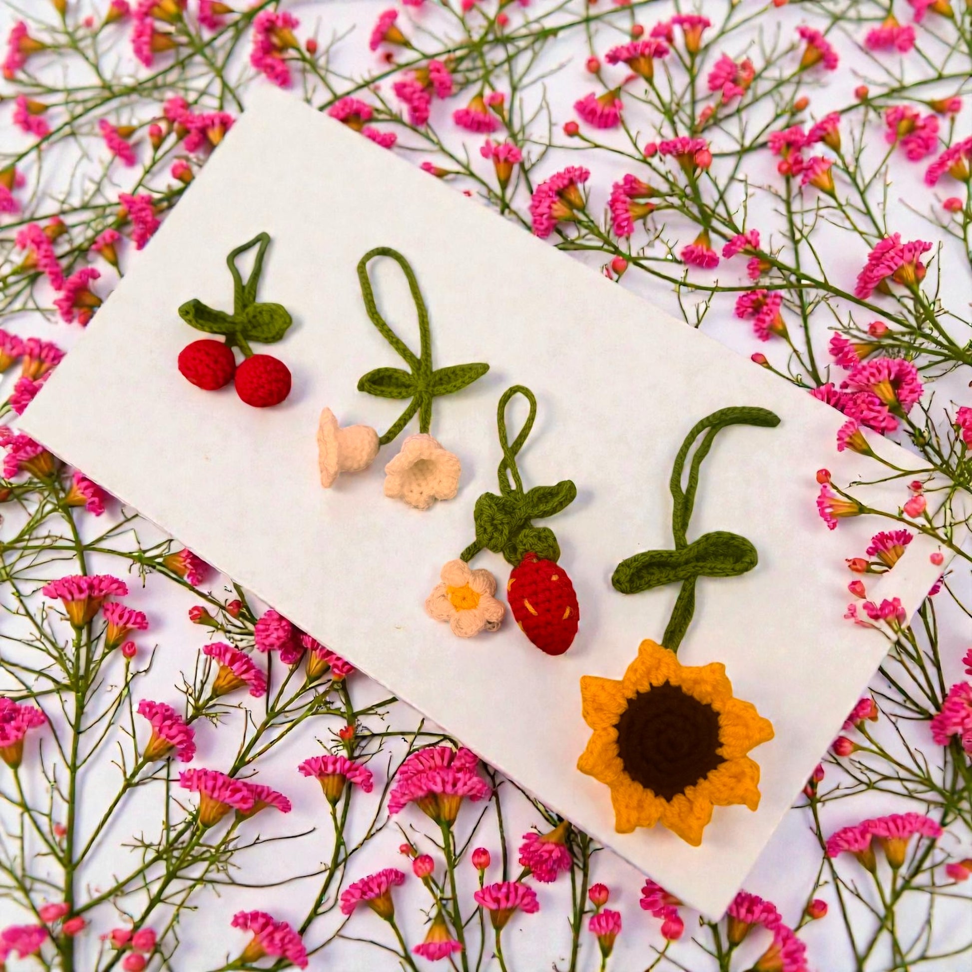 Décorations réalisées à la main au crochet, inspirées de la nature et des formes florales. Légères et délicates, elles se suspendent facilement à un rétroviseur ou à un autre support pour apporter une touche douce et poétique au quotidien.