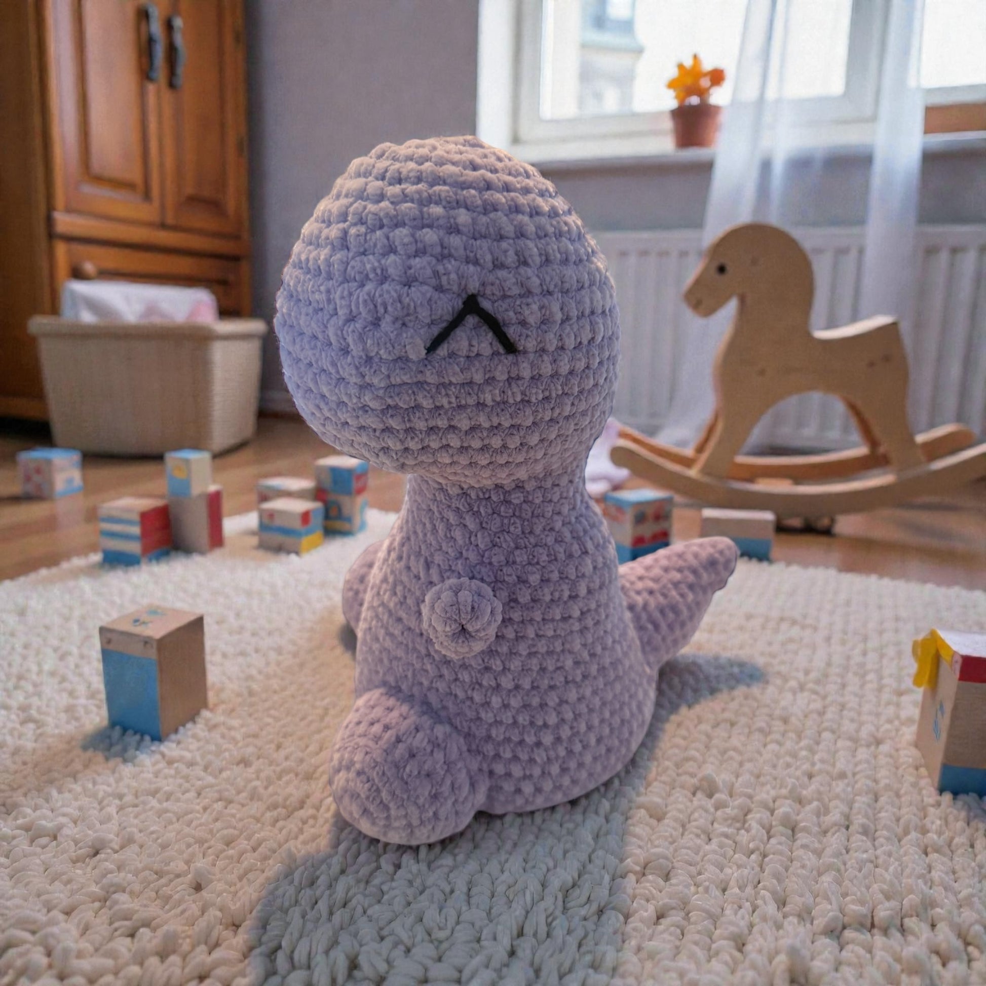 Ce dino tout en rondeur est crocheté à la main avec soin pour un rendu moelleux et ultra doux. Son design minimaliste et ses grands yeux le rendent à la fois drôle et attendrissant. Une peluche parfaite pour décorer ou câliner !